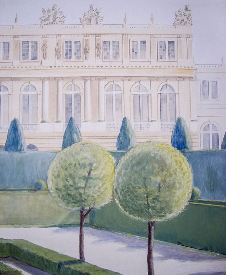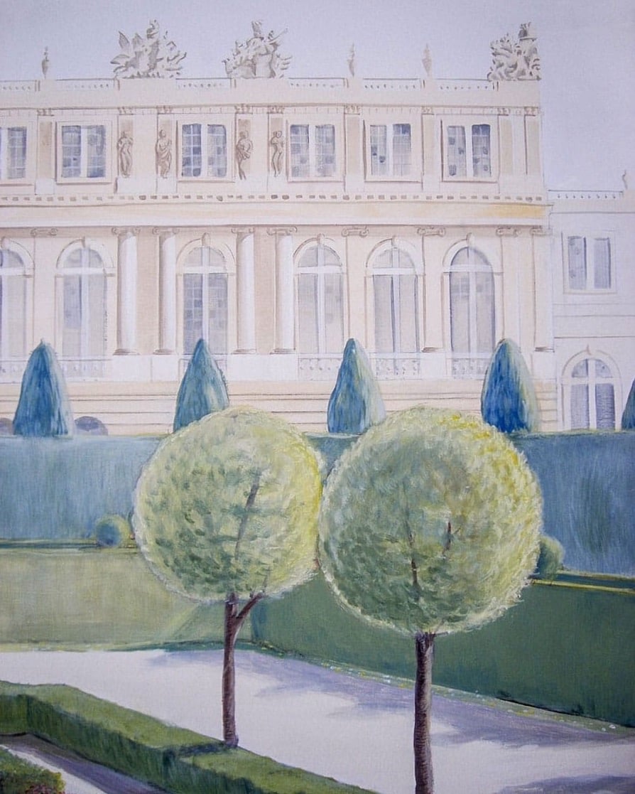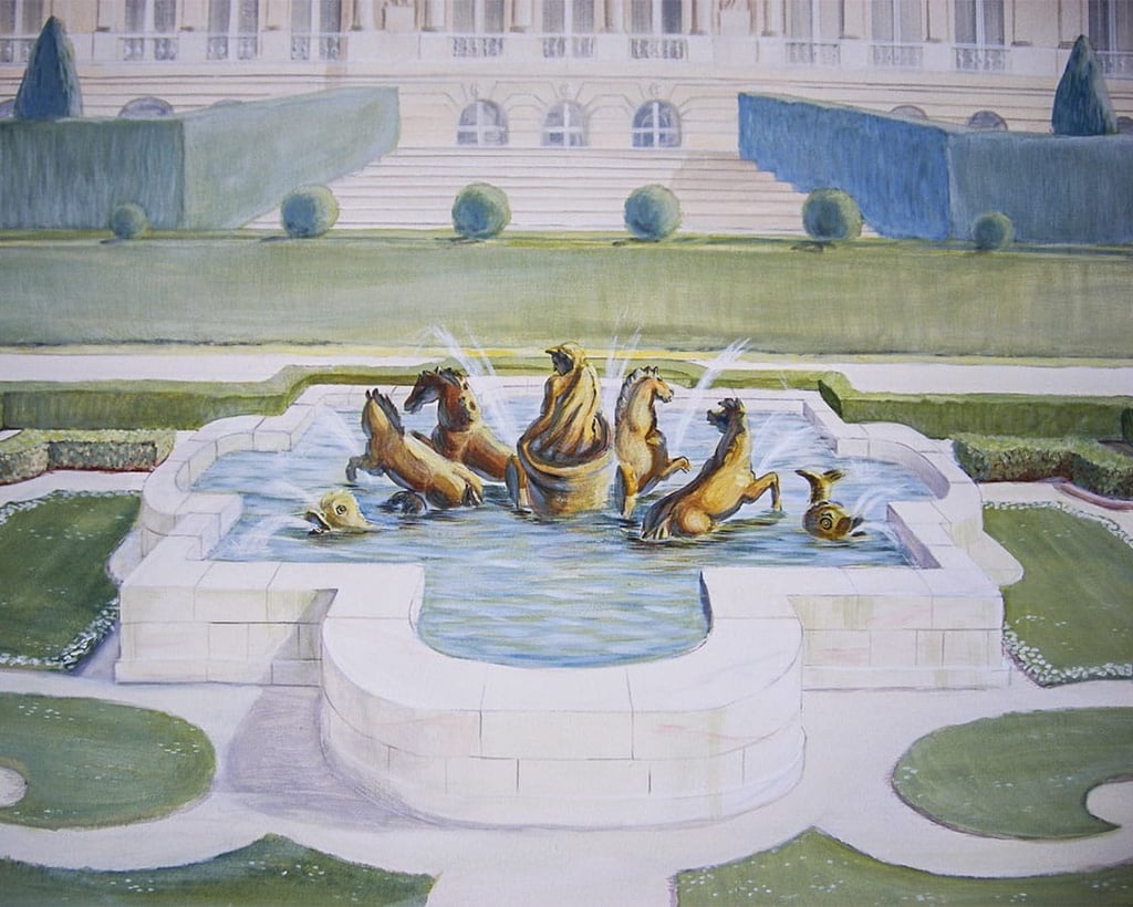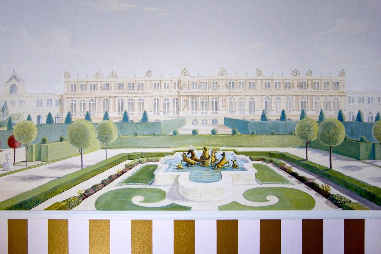 A hand-painted dreamscape of the Palace of Versailles, created for a little girl’s own enchanted garden room