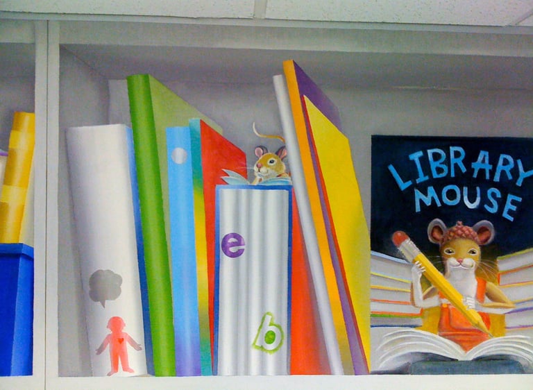 A supersized bookshelf mural where stories come alive and characters peek out to play.