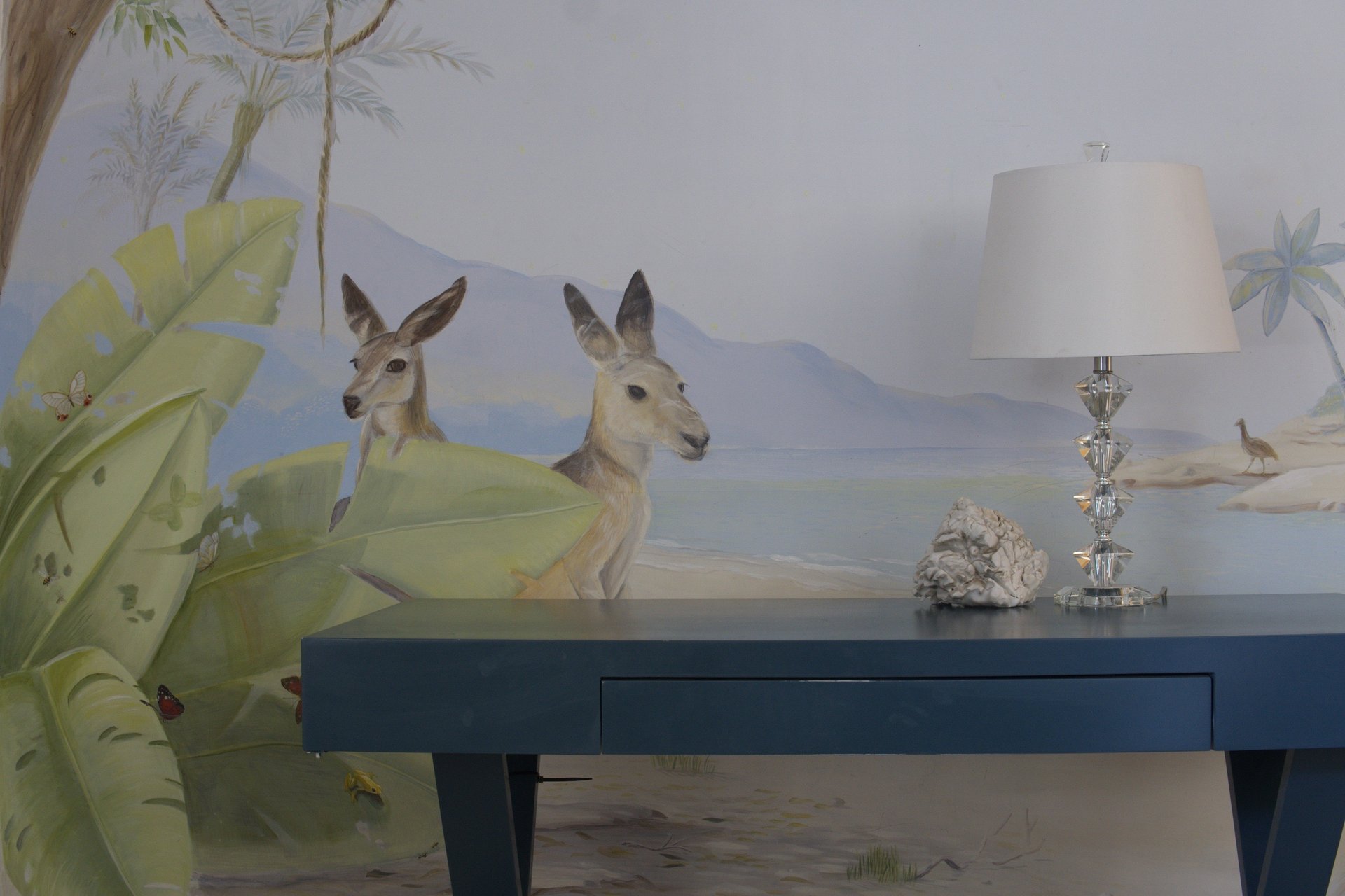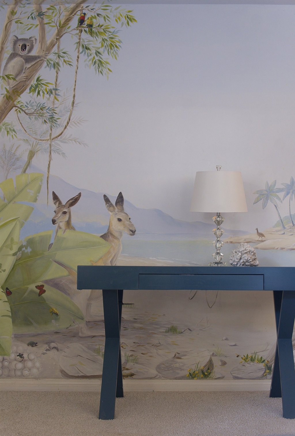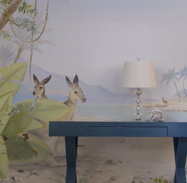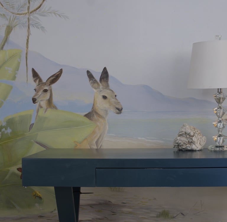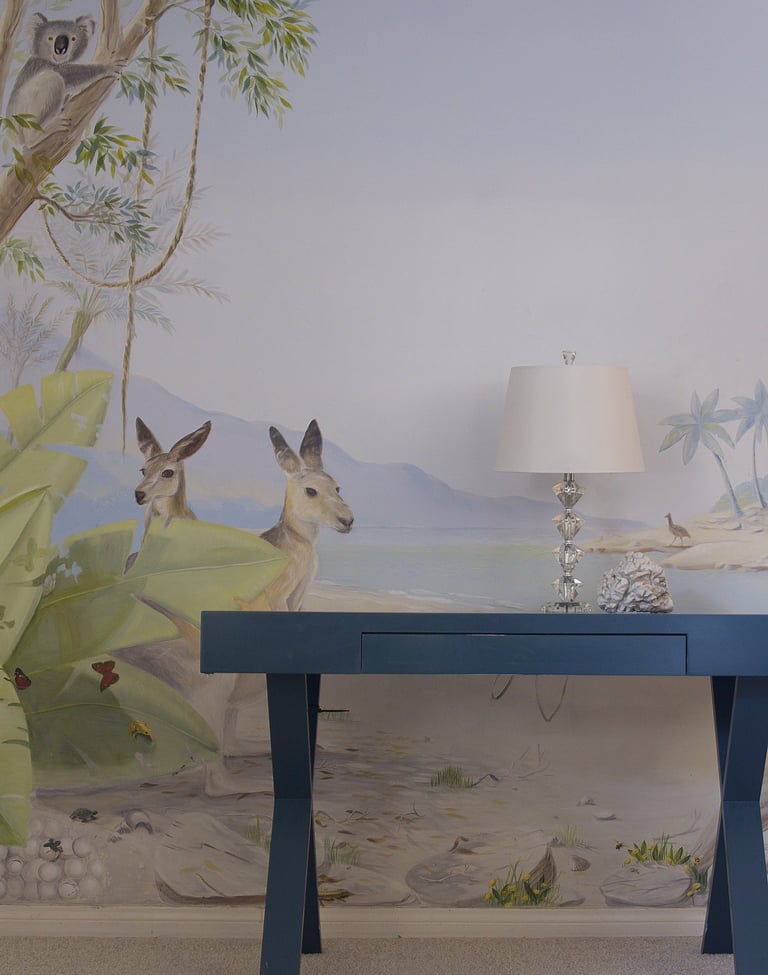 Beneath a soft Australian sky, two kangaroos pause by the shore while an iguana basks in the sun. Painted in quiet tones of sand and leaf, the mural captures the stillness between play and rest—a gentle rhythm that makes a child’s room feel like morning light
