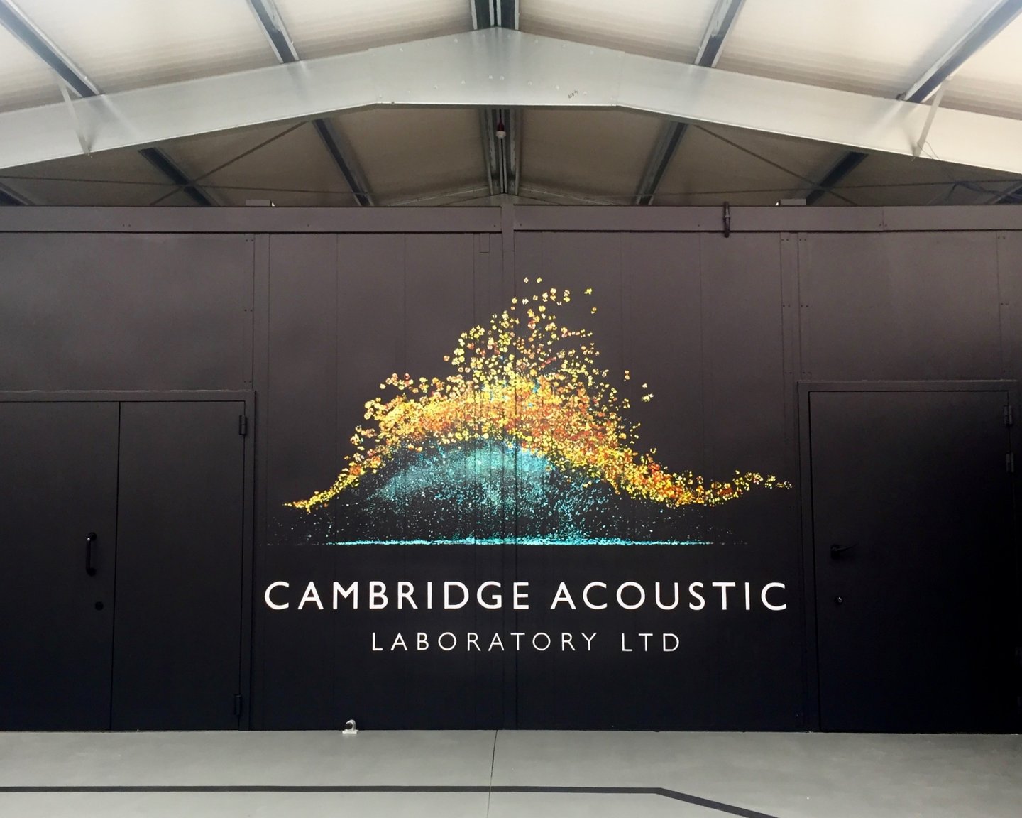 Cambridge Acoustic wanted their vibrant, detailed logo to make a statement on a large industrial wall. The black background enhances the golden and turquoise acoustic dots, while crisp white lettering gives the logo a powerful, professional and artistic presence.